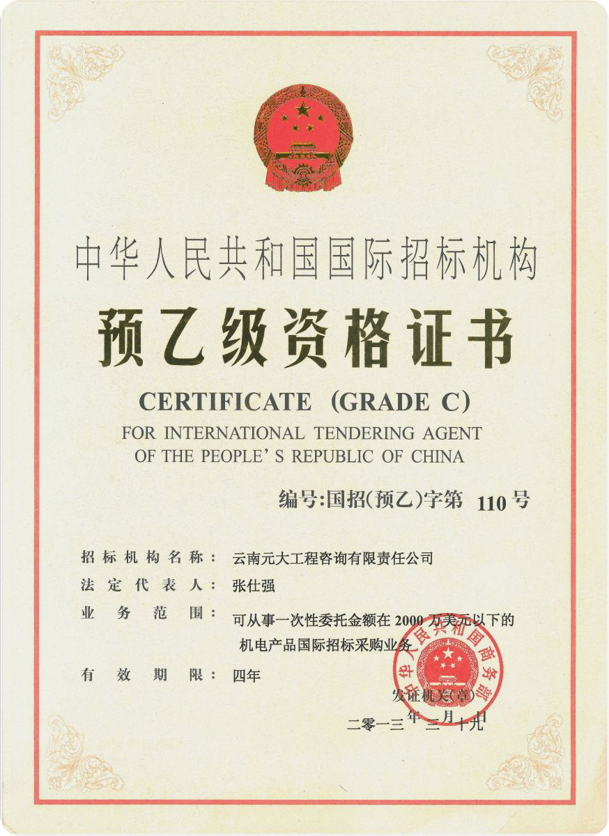 公司是云南省招標投標行業協會會長單位,現為云南省住建廳信用評級招標代理機構AAA級單位。公司先后榮獲住建部頒發的“工程招標代理機構甲級資質證書”、財政部頒發的“政府采購代理機構甲級資格證書”,并在財政部及中國政府采購網“政府采購代理機構名單”登記備案、獲得國家發展改革委頒發的“中央投資項目招標代理機構甲級資格證書”、商務部頒發的“國際招標機構預乙級資格證書”、機電產品國際招標電子交易平臺頒發的“機電產品國際招標電子交易證書”、國家國防科技工業局頒發的“軍工涉密業務咨詢服務安全保密條件備案證書”。公司已通過ISO9001:2015質量管理體系認證、ISO14001:2015環境管理體系認證、ISO45001:2018職業健康安全管理體系認證。納稅信用評價已連續三年被評為A級......